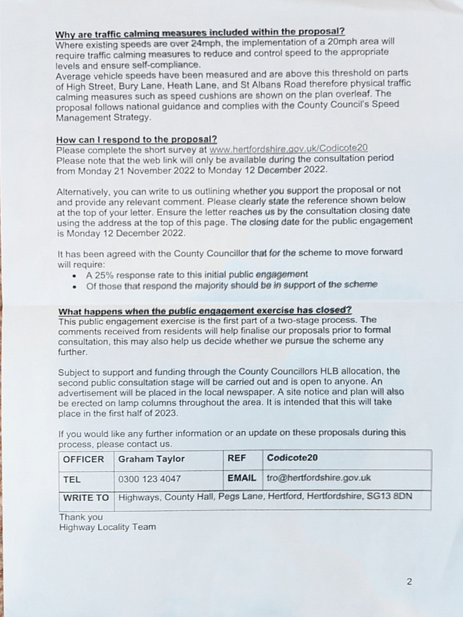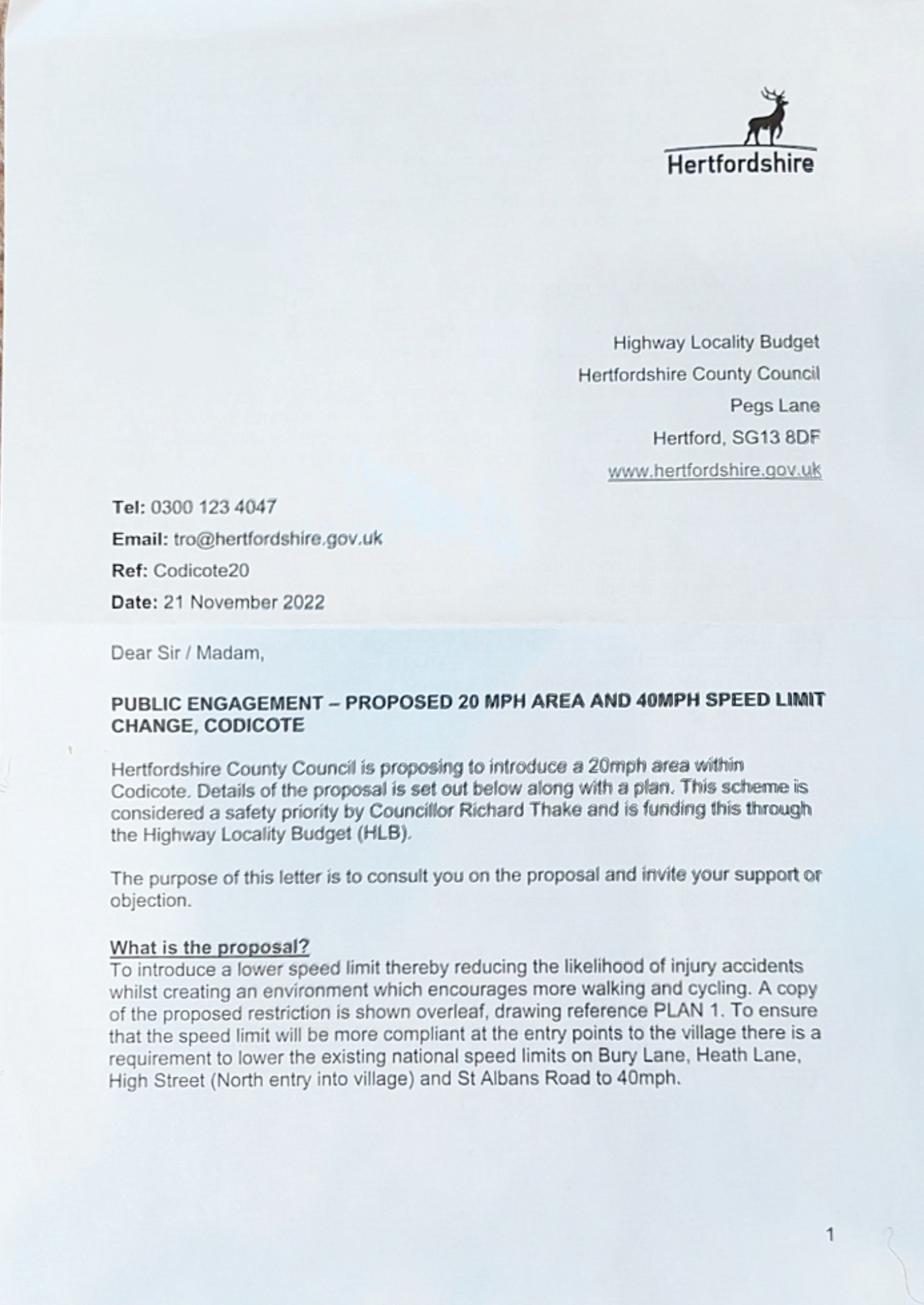 Consultation papers are attached and HCC is asking for online responses at https://www.hertfordshire.gov.uk/codicote20 . The closing date for the consultation is Monday 12 December.